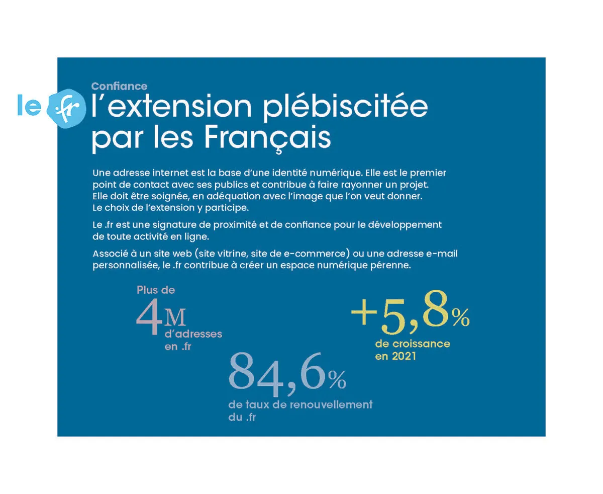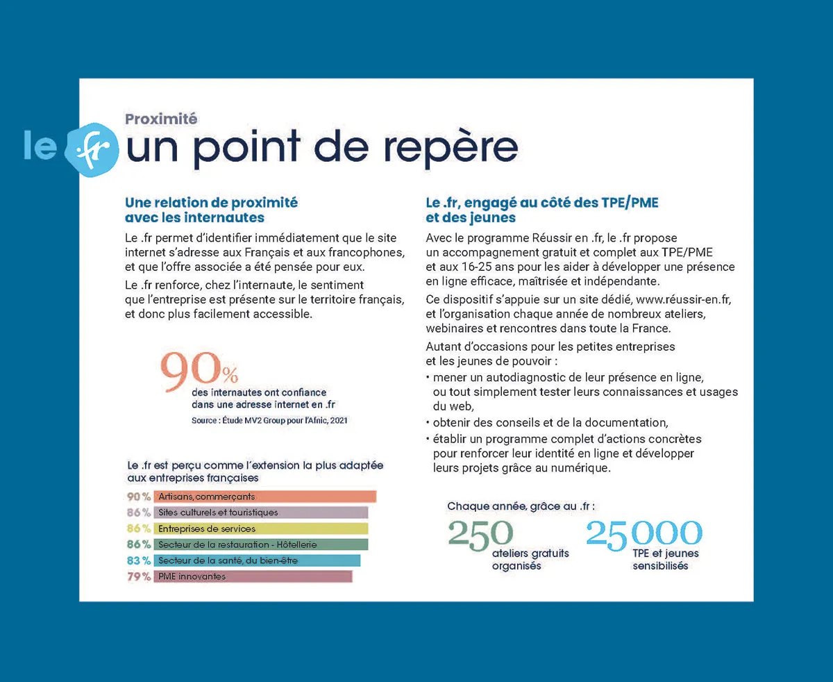 Le .fr est une signature de proximité et de confiance pour le développement de toute activité en ligne. Associé à un site web (site vitrine, site de e-commerce) ou une adresse e-mail personnalisée, le .fr contribue à créer un espace numérique pérenne.